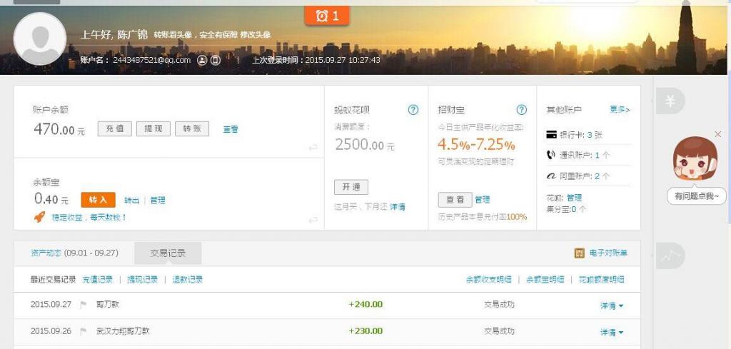 9月27日樂山紅棉風管匯款240元至支付寶賬戶